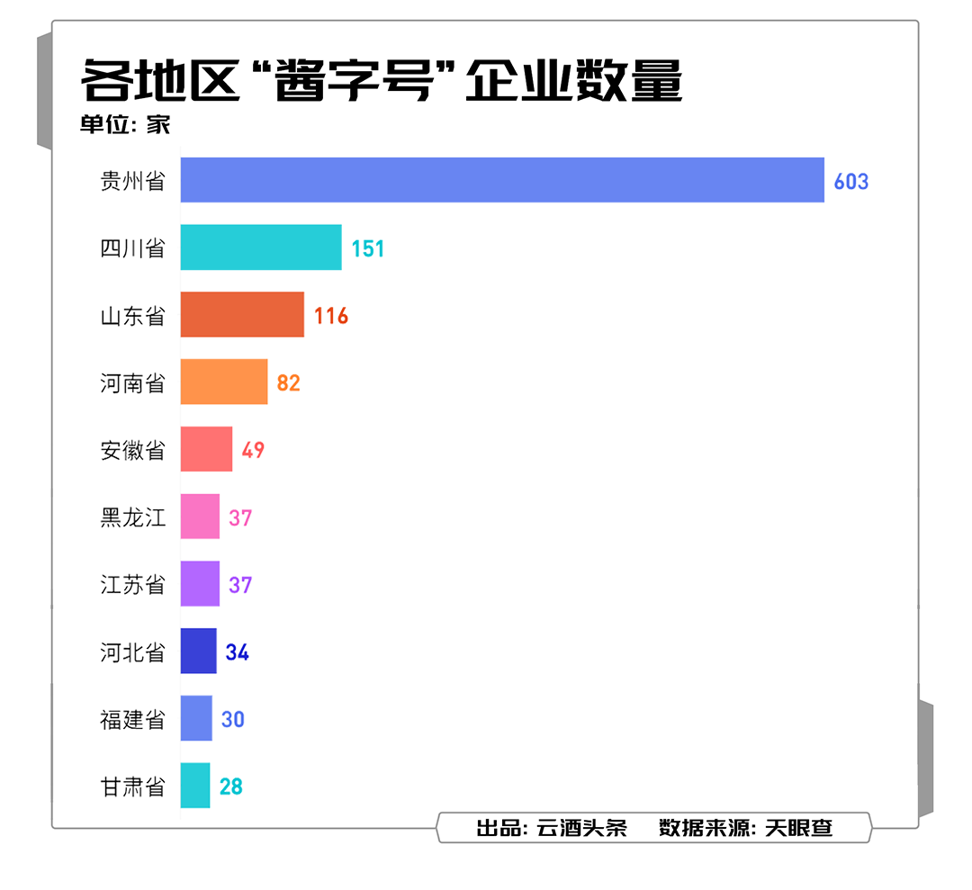 据天眼查数据显示,目前,1469家“酱字号”酒类企业(即处于存续状态,国内名称、经营范围或商标、专利中带“酱”的酒企)中,有603家都位于贵州,而其中441家都集中在遵义仁怀。