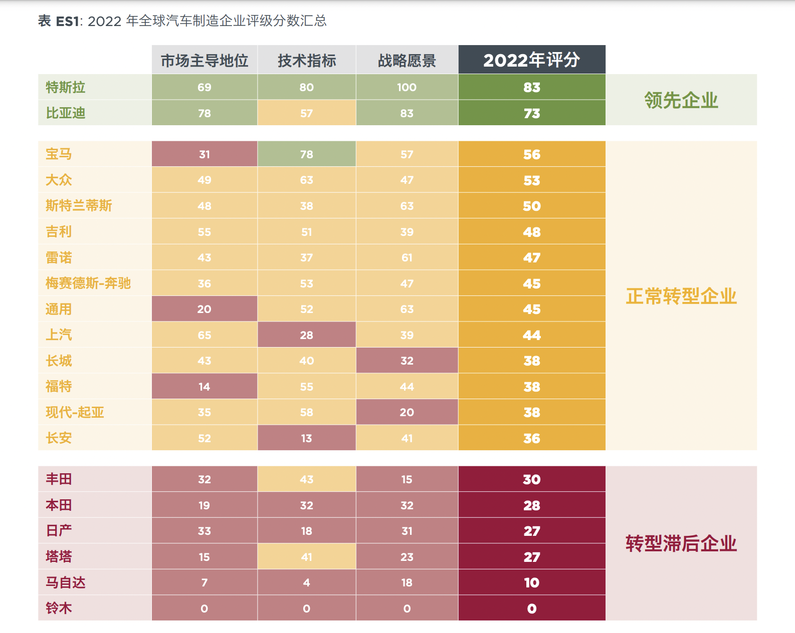美国研究机构国际清洁交通委员会(ICCT)5月31日发布报告,针对全球20家大型汽车企业向纯电动汽车转型的评价结果显示,排名最靠前的是特斯拉和比亚迪两家企业,属于“领先企业”,宝马排在第3名,排“正常转型企业”首位。丰田及本田等5家日本汽车制造商被评价为“转型滞后企业”。