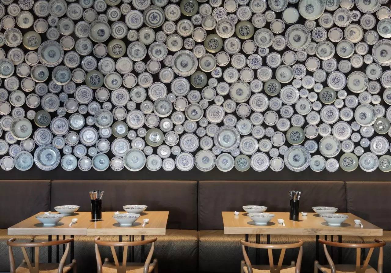 宁波的台湾牛肉面,天花板上大大小小的白瓷碗是他童年在台湾生活经历中,台式牛肉面店里的经典元素。