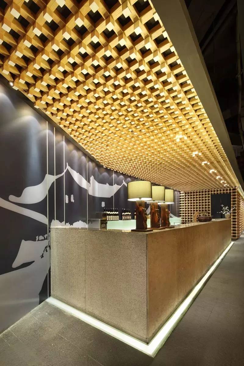上海“烧肉达人”中这面看上去像榫接而成的木墙,隐喻了烤肉炭火的元素以及日料的文化特质。