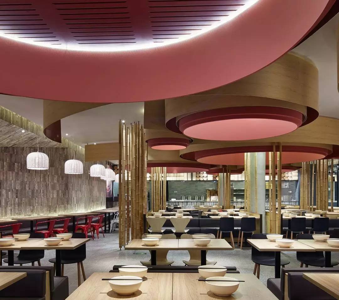 北京的阳阳小吃,提供的是包子油条等实惠早餐,店中用到了蒸笼外围的纹理和曲线元素,与地面的座位区域相呼应。