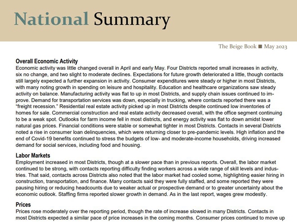 各区的运输服务需求下降,特别是卡车运输,联系人报告出现了“货运衰退”。房地产方面,大部分地区的住宅房地产活动增加,商业建筑和房地产活动总体下降。金融上,大部分地区的金融状况稳定或者出现收紧。多个地区的联系人注意到消费者贷款违约的情况增多,正在接近新冠疫情前水平。