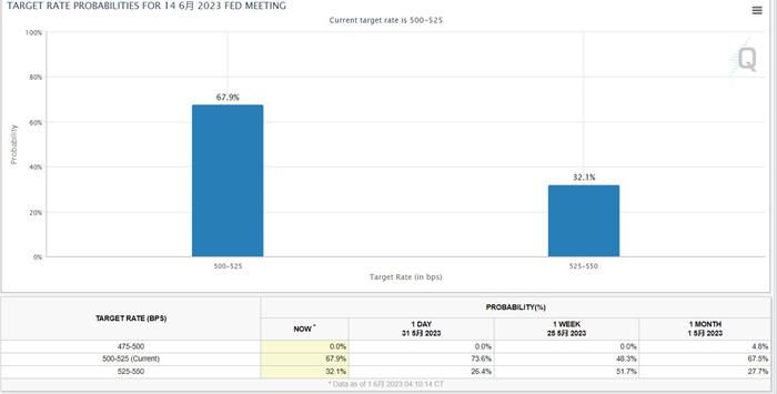 杰弗逊和哈克表态后,“美联储观察”显示的6月加息概率下降至26.4%,暂停加息概率升至73.6%。北京时间6月1日下午,6月加息概率回升至32.1%,暂停加息为67.9%。