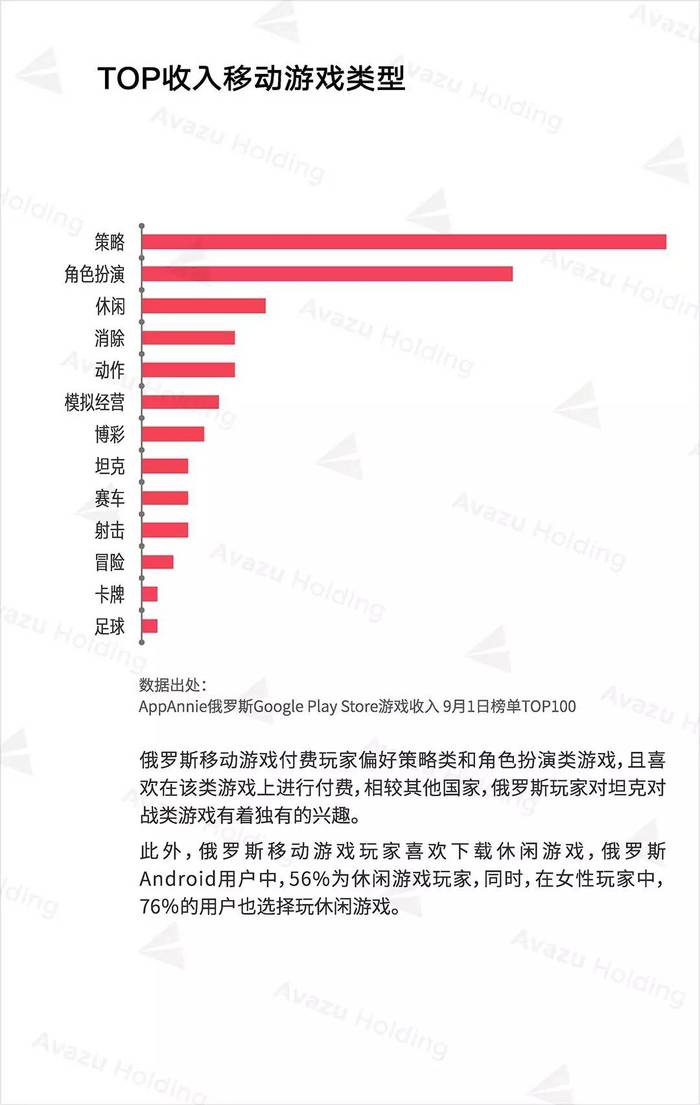 3.俄罗斯手游玩家偏好策略类和角色扮演类游戏,且喜欢在该类游戏上进行付费,此外,俄罗斯玩家对坦克对战类游戏有着独特的兴趣。策略类和角色扮演类虽是俄罗斯收入最高的游戏类型,开发商也基本都瞄准该类游戏进行开发,对于小规模游戏开发商而言,不妨另辟蹊径,尝试坦克对战类游戏的开发,说不定在俄罗斯市场能收到意想不到的收获。