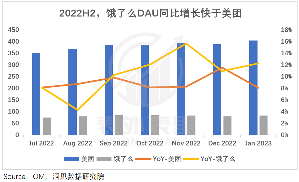 去年,上线“免单1分钟”活动,数次冲上了热搜,成功出圈。如下图,去年8月以来,饿了么DAU同比增速维持在10%以上,高于美团。