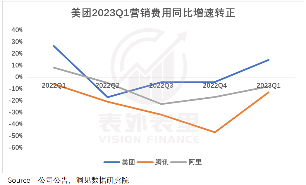可以看到,虽然3月份才开始进行补贴,但2023Q1美团营销费用达到104亿元,同比增长14.5%,在以降本增效为主旋律的互联网大厂中,格外醒目。