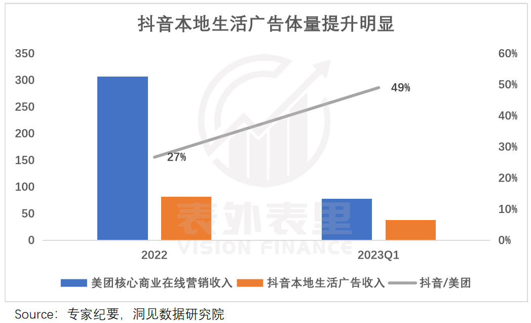 这在数据上已有印证。可以看到,2022年抖音本地生活业务的广告收入仅占美团核心商业板块在线营销收入的27%,但2023Q1这一比例已飙升至49%。