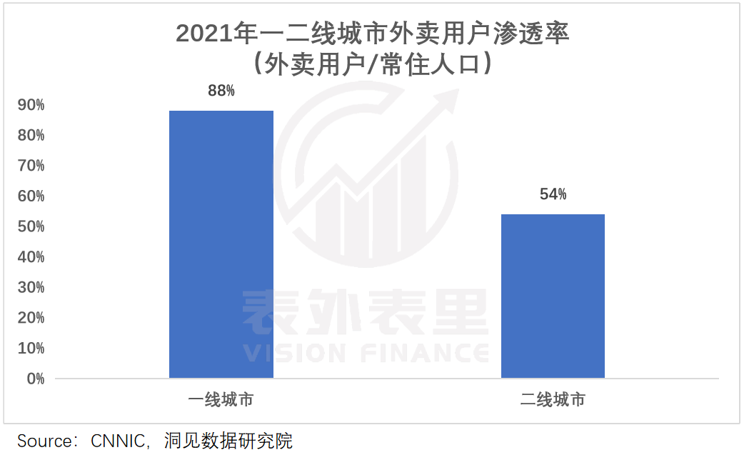 而一线城市的外卖渗透率却是接近饱和——2021年一线城市的外卖渗透率88%,二线城市渗透率54%,能够渗透的空间几乎没有。