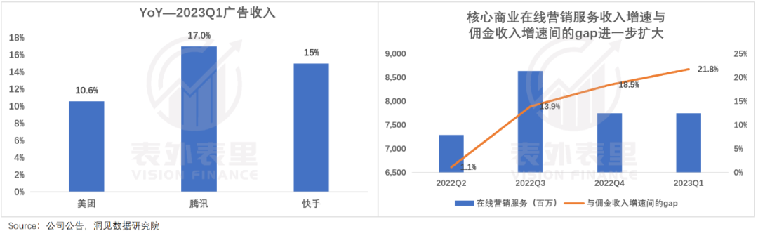 可以看到,疫情放开后餐饮、酒旅板块复苏弹性最高,但美团核心商业板块的在线营销服务收入仅同比增长10.6%,被隔壁腾讯、快手碾压。
