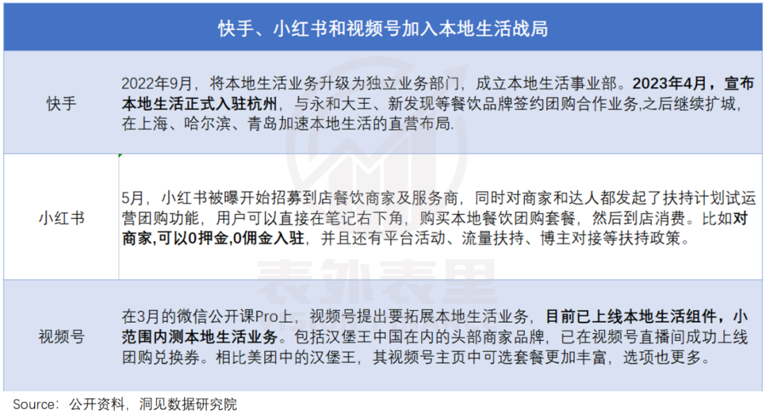 面对抖音一家的压力,美团已然捉襟见肘。更严峻的是,在抖音验证了内容平台做本地生活服务的可行性之后,快手、小红书、视频号等前赴后继加入战局。