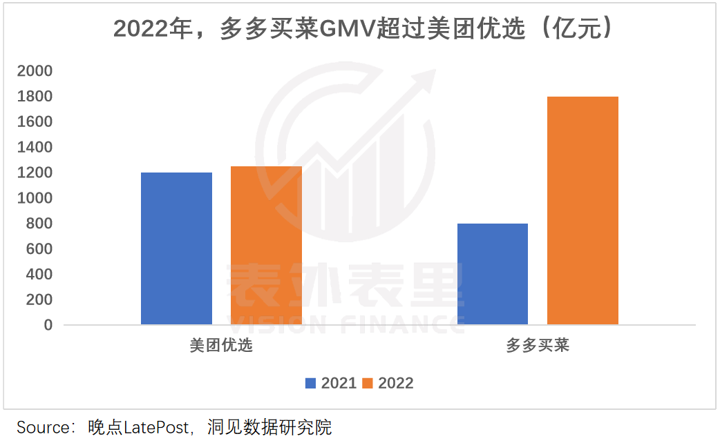 2022年美团优选的交易额同比几乎零增长,被多多买菜超越:多多买菜约1800亿,美团优选约1250亿。