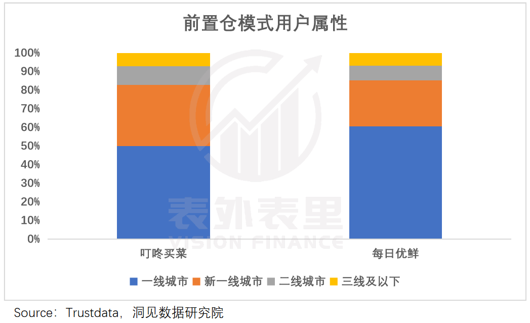 可以看到,叮咚买菜和每日优鲜在一线及新一线城市用户占比都超过80%,只有这些城市快节奏、消费能力强的年轻人才会更加青睐这种即时零售模式。