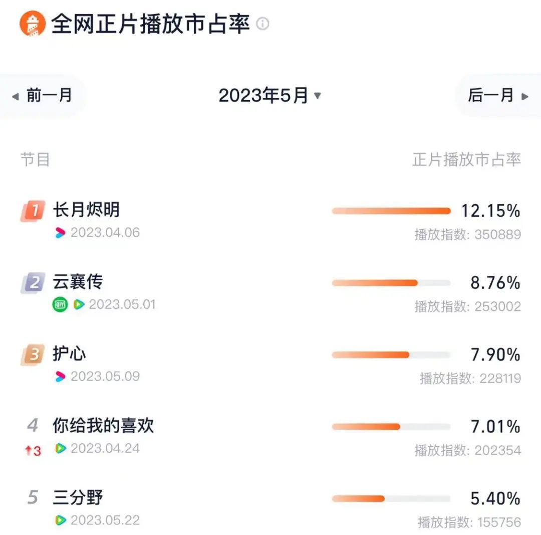 其次是热度方面,没有超越《长月烬明》的作品出现。据灯塔专业版显示,5月剧集热度TOP10里,《长月烬明》仍排在第一,且是唯一一部正片播放市占率过两位数的。