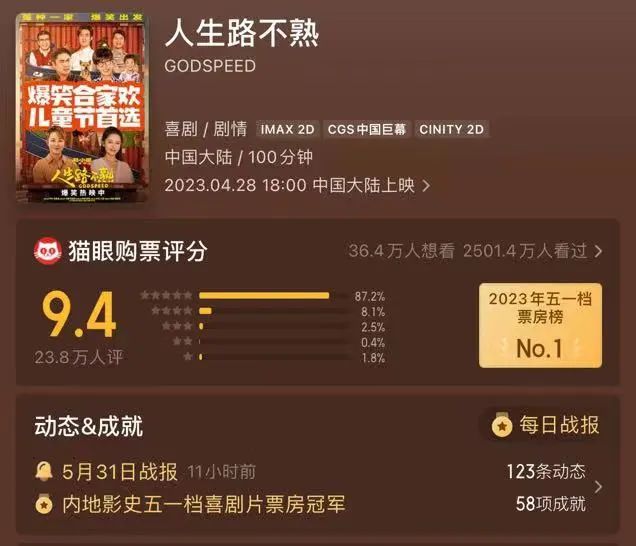 月度冠军来自五一档影片《人生路不熟》。这也是今年除春节档三甲《满江红》《流浪地球2》《熊出没·伴我“熊芯”》之外第一部票房破十亿的电影。