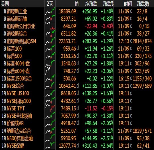 截至收盘,标普500指数收涨1.11%,报2163.26点,在突破50日和100日均线后扩大涨幅;道指收涨1.4%,报18589.69点,创下2个月高点;纳指收涨1.11%, 报5251.074点;罗素2000指数收涨3.1%,为1月份以来最大涨幅。美股成交大约120亿股,较3个月均值高80%,且为6月份英国公投以来最大成交量。