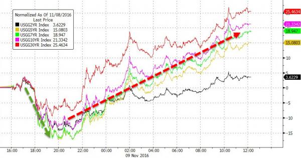 债市血流成河,美国国债创多年来最大跌幅,收益率曲线大幅陡化,因市场预期特朗普胜选后将与共和党控制的美国国会加大财政刺激力度,从而会导致通胀升温...
