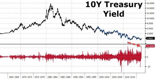 10年期美债收益率创历史最大百分比涨幅,且自1月份来首次升逾2%。国债在亚欧时段起初的避险上涨在美国时段被回吐;10年期国债收益率一度跌14个基点,其盘中37个基点的波幅略超过2014年10月14日,截至收盘,10年期美债收益率大涨20个基点...