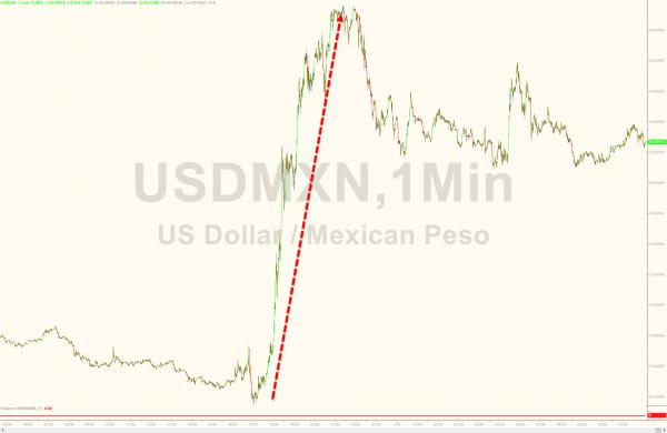 墨西哥比索汇率兑美元暴跌,创下1994年“龙舌兰酒危机”(也就是墨西哥金融风暴)以来的最大跌幅,虽然之后反弹收复了部分跌幅,但最终仍收跌近9%...美元兑墨西哥比索的成交量是同时段正常水平的63倍...