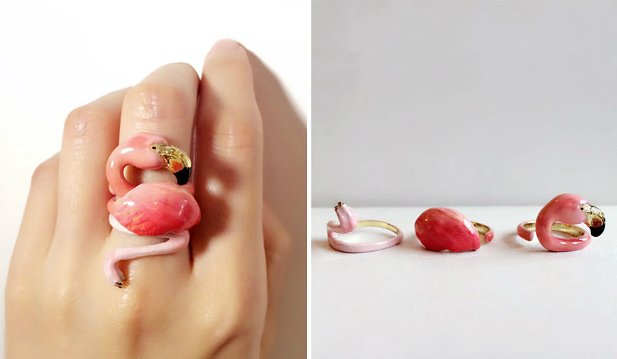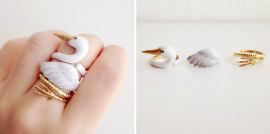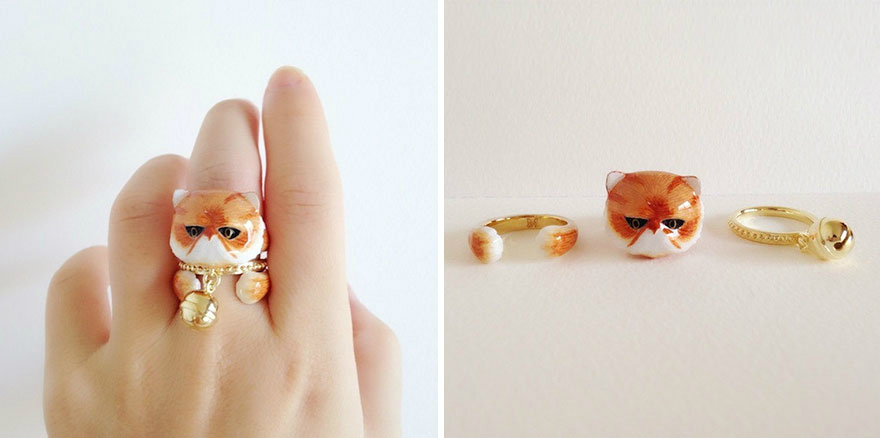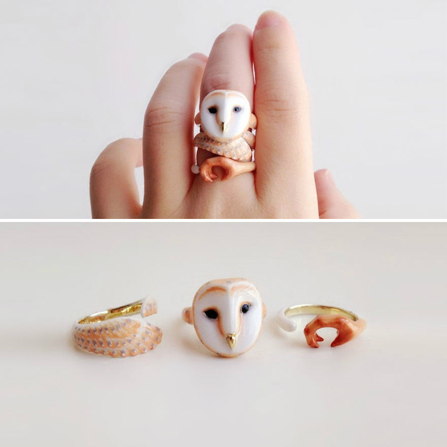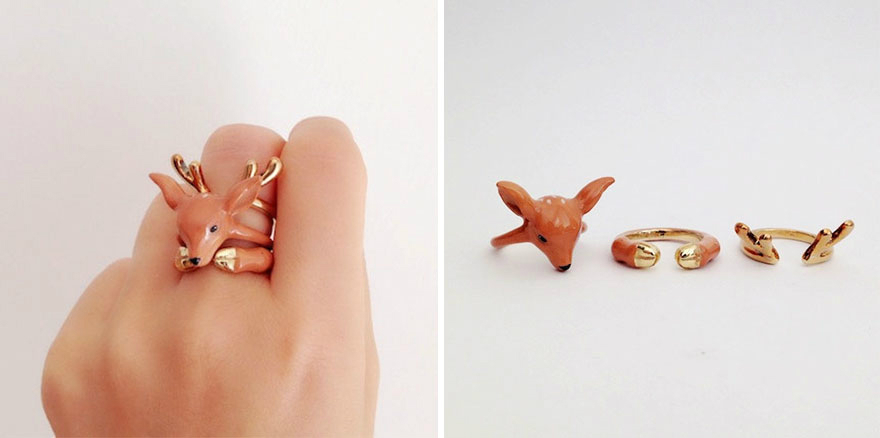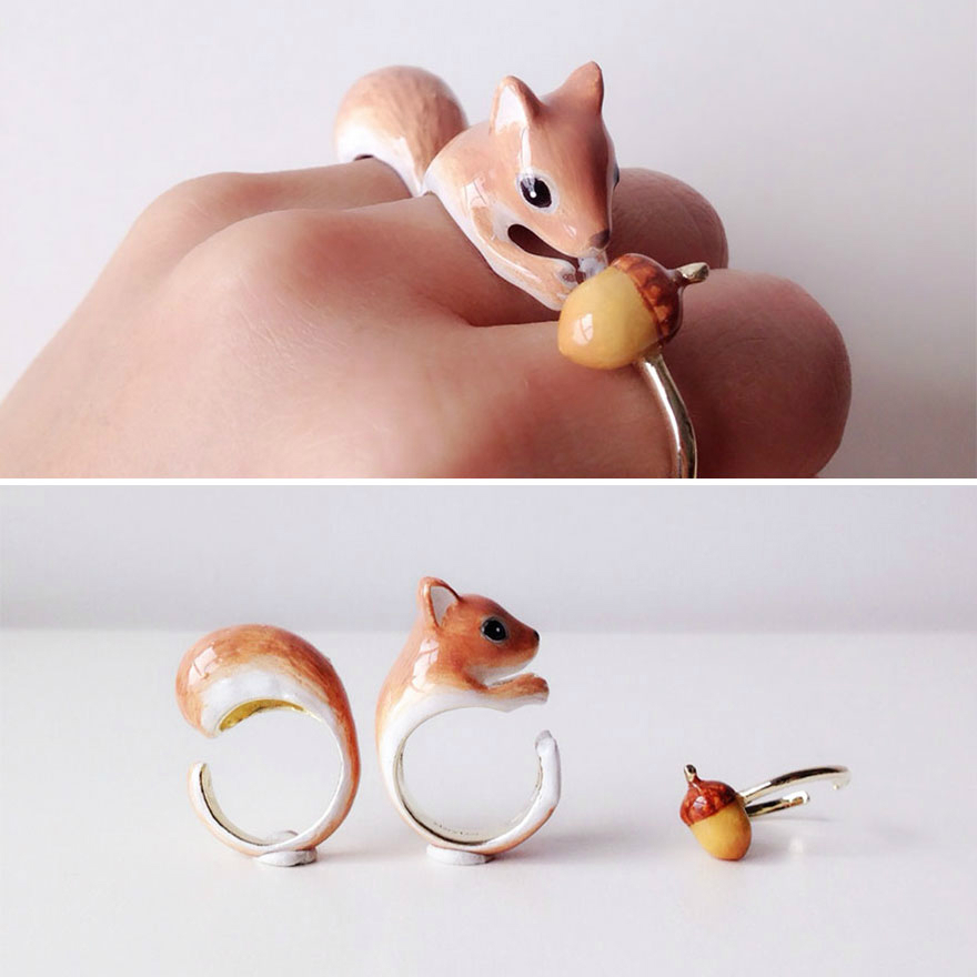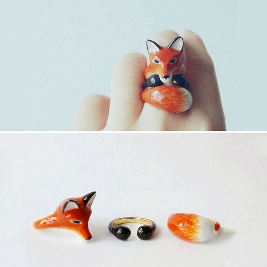 她做了一系列三合一戒指,组合在一起是可爱的抱着你手指的动物。从树懒到狐狸,这些小动物是把黄铜上釉后制成的,这样的材质可以让您的戒指长久光亮。