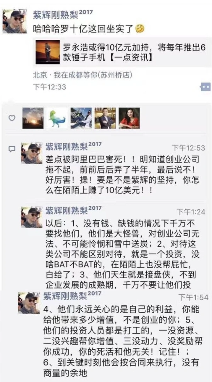 锤子科技早期投资人、紫辉创投创始合伙人郑刚曾在朋友圈为罗永浩鸣不平:“(锤子)差点被阿里巴巴害死!!明知道创业公司拖不起,前前后后弄了半年,最后说不!要是不是紫辉的坚持,你怎么在陌陌上赚了10亿美元!!”