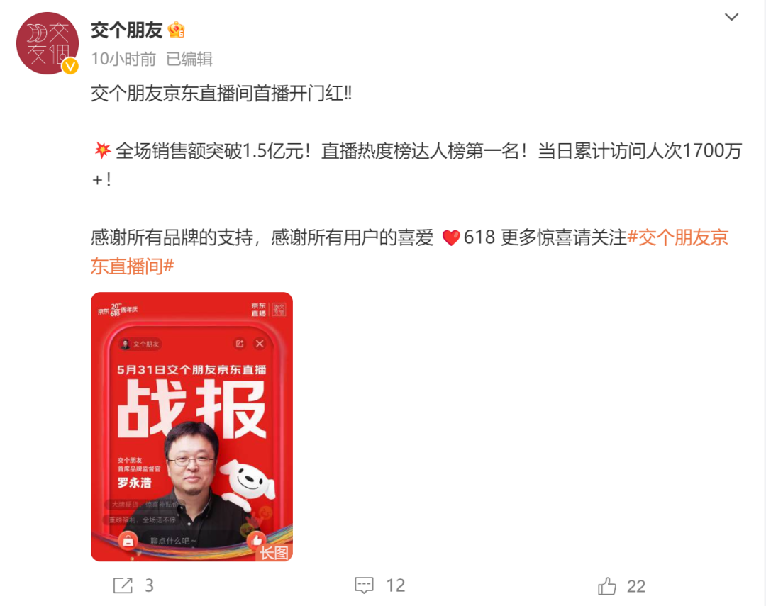 根据交个朋友官方微博,这场直播的数据最终定格在销售额突破1.5亿元,当日累计访问人次1700万。