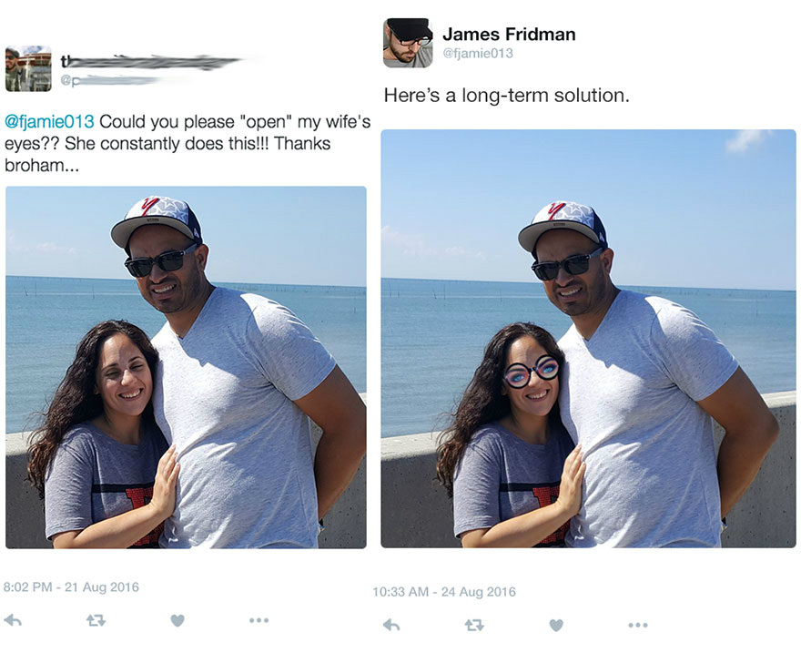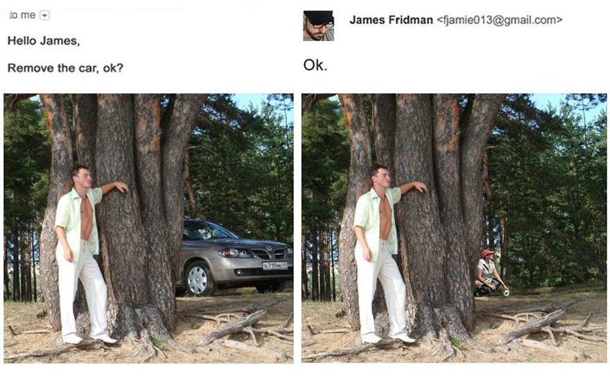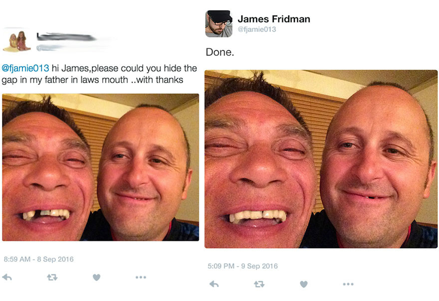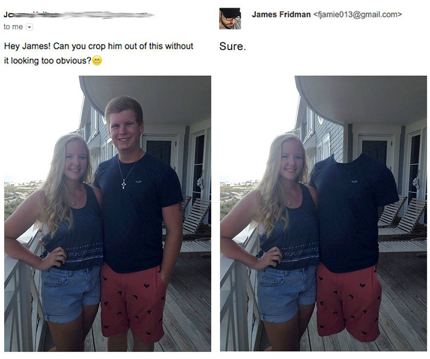 人类呀,我们已经警告过你们好多词了,不要随便在网上让别人帮你P照片。然而还是有一些人把自己的照片发给Photoshop大师James Fridman,照片的瑕疵就变成了笑点。