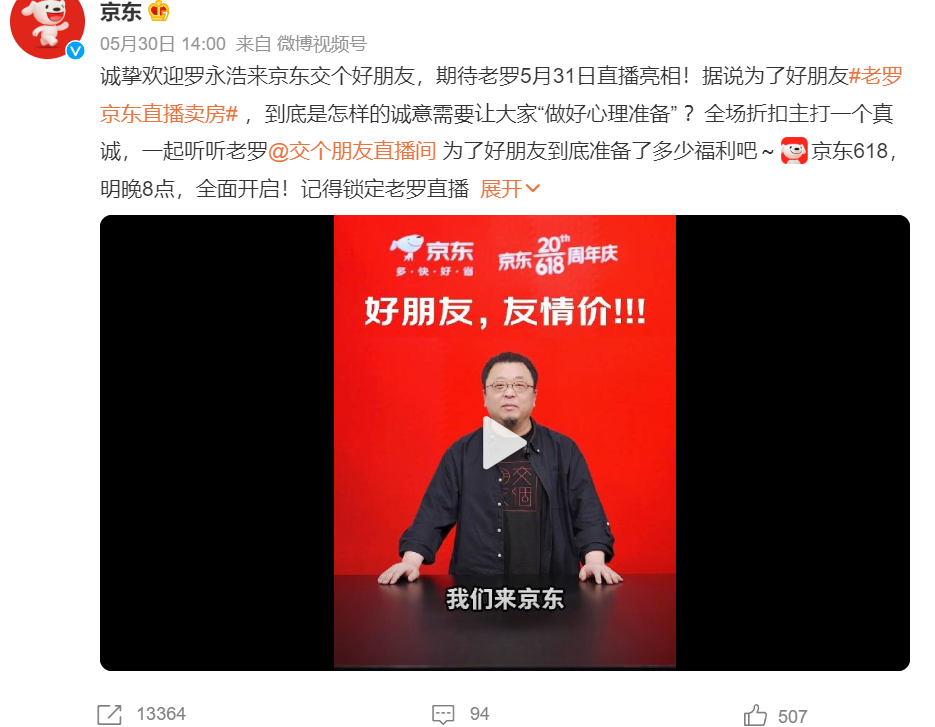 在淘宝直播卖完卫星的罗永浩,5月31日,去京东直播卖房了。
