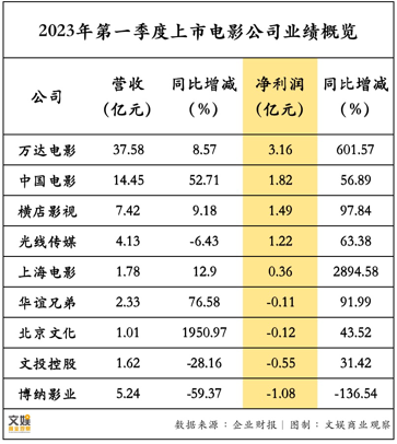 据文娱君统计,在近期发布2023年一季度报的9家电影上市公司中,除博纳影业外,余下8家都实现了净利润同比上涨,其中净利润最高的万达电影、中国电影和横店影视分别盈利3.16亿元、1.82亿元和1.49亿元。