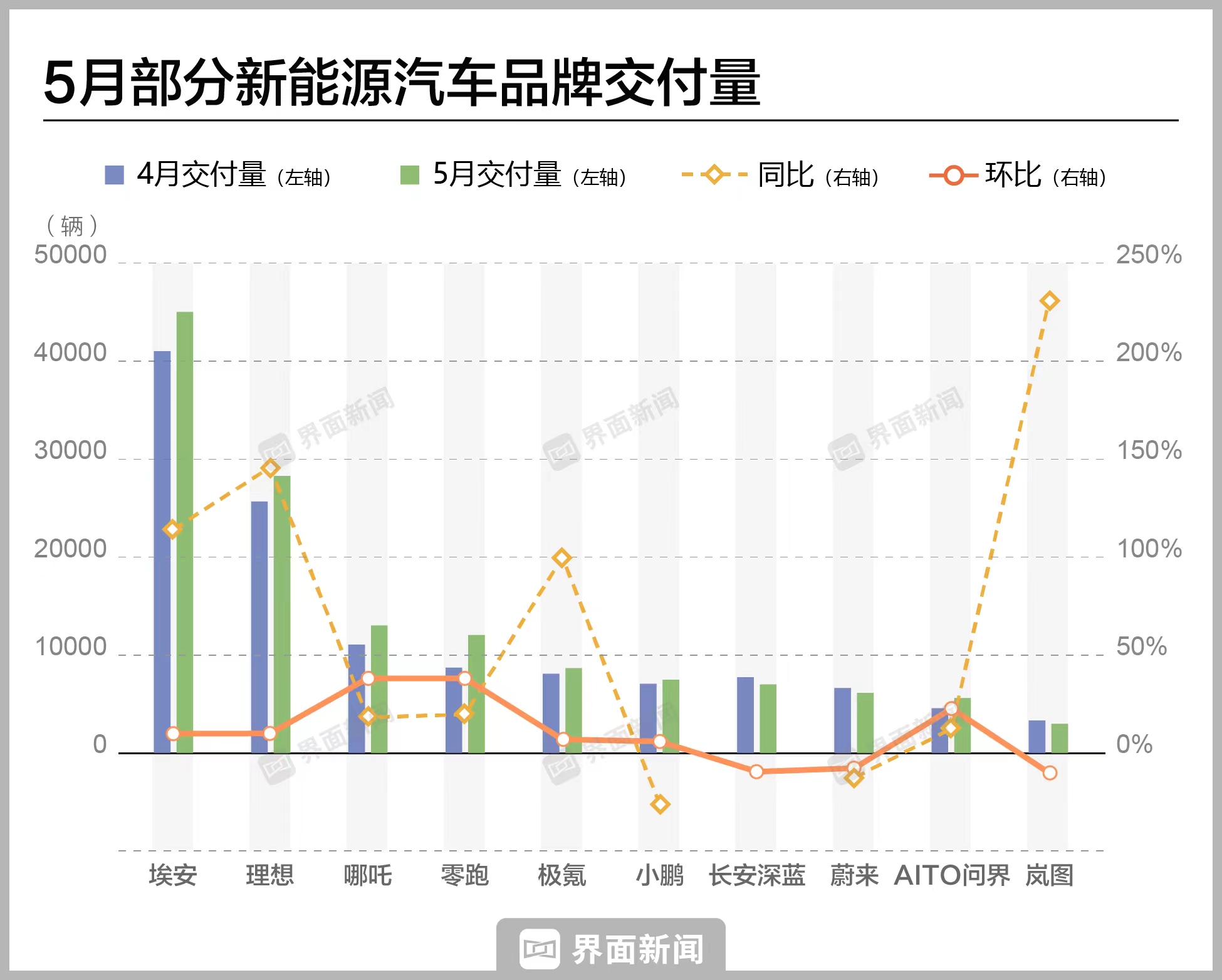 华为联合打造的AITO问界5月交付5629辆新车,同比和环比皆有增长。东风岚图和长安深蓝则都出现了环比下滑的现象,岚图交付新车3003辆,虽同比增长两倍多,但环比下跌10%。深蓝5月交付量为7021辆,环比下降9.4%。