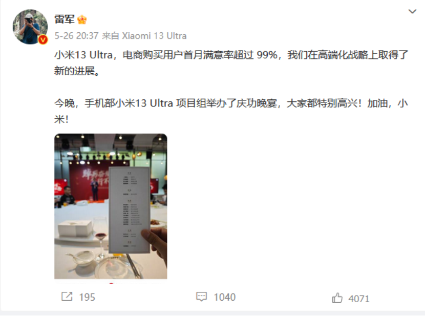 “小米13 Ultra,电商购买用户首月满意率超过 99%,我们在高端化战略上取得了新的进展。今晚,手机部小米13 ultra 项目组举办了庆功晚宴,大家都特别高兴! 加油,小米!”