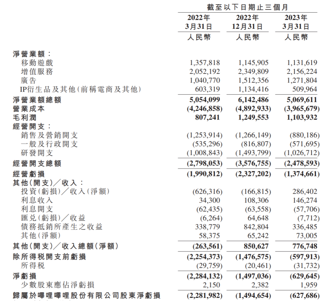 “IP衍生品及其他”一季度营收5.1亿元,较2022年同期收窄15%,主要是由于B站电商平台的动画、漫画及游戏(ACG)IP衍生品商品销售减少所致。
