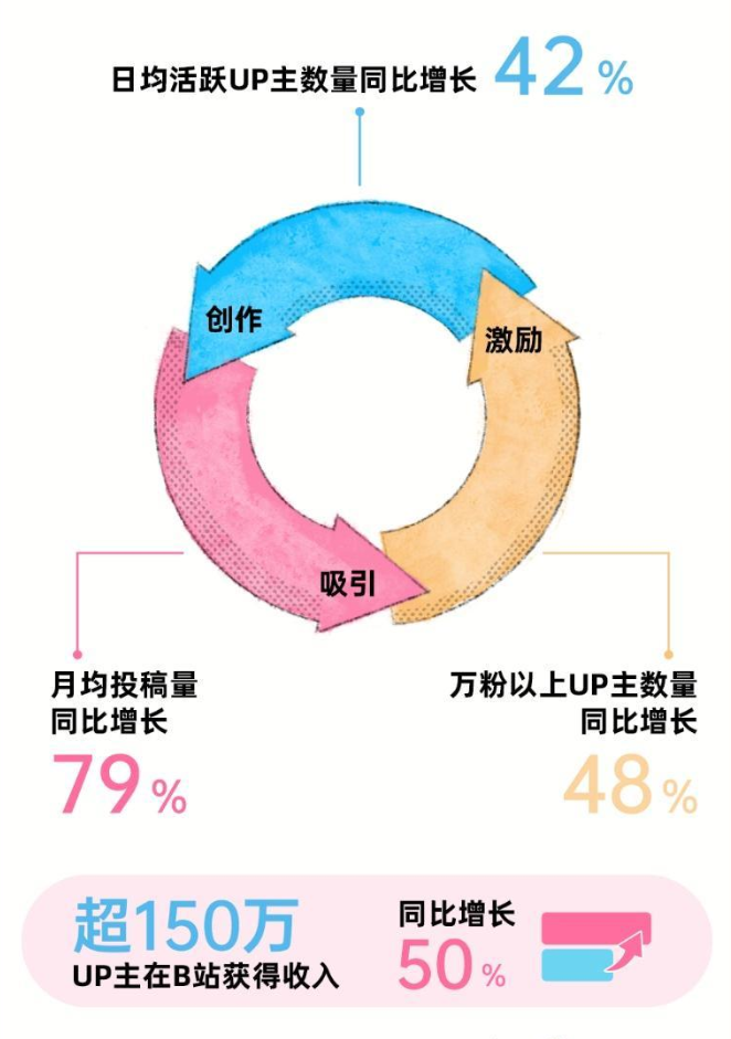 超150万UP主在B站获得收入,月均投稿量同比增长79%,视频生态对直播业务赋能