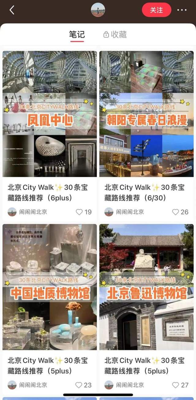 “从去年开始,我在社交平台上就经常刷到Citywalk的相关视频和笔记。我本身就喜欢旅行,而且是‘攻略型’旅行选手,所以对我而言,规划和设计路线并不难。而且我周末基本都在北京玩,脑子里基本上有张‘北京吃喝玩乐地图’。再者,我目前还不能离职去做旅行博主,所以只能利用周末时间,去做规划。因此,对我而言Citywalk的内容比较好生产,而和我一样的打工人正是这些内容的需求者。”闹闹表示。