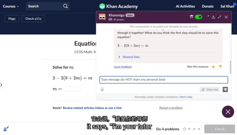 可汗用一道简单的数学题为例,“3-2(9+2m)=m,计算出m的数值”。只需点击页面右下角的Khanmigo,AI就会给出提示。不过,Khanmigo的好处在于,它不会直接告诉答案,而是循循善诱,反问“你认为解决这个问题的下一步是什么?”