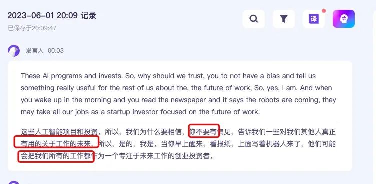 在进行实时记录并同步翻译测试上,猎云网采用了B站上TED官方标题为《ChatGPT如此强大,AI的崛起让人类何去何从?》的视频语音。在同步翻译的过程中,可以发现比对中文字幕,听悟的翻译结果总体意思理解尚可,但是在语句在翻译的顺序上有所偏差,譬如“在关于未来工作真正有用的东西”,听悟的结果为“有用的关于工作的未来”,同时可能存在部分缺漏的翻译情况,譬如“他们可能会抢走我们所有的工作”,关于“抢走”这个动词没有体现。