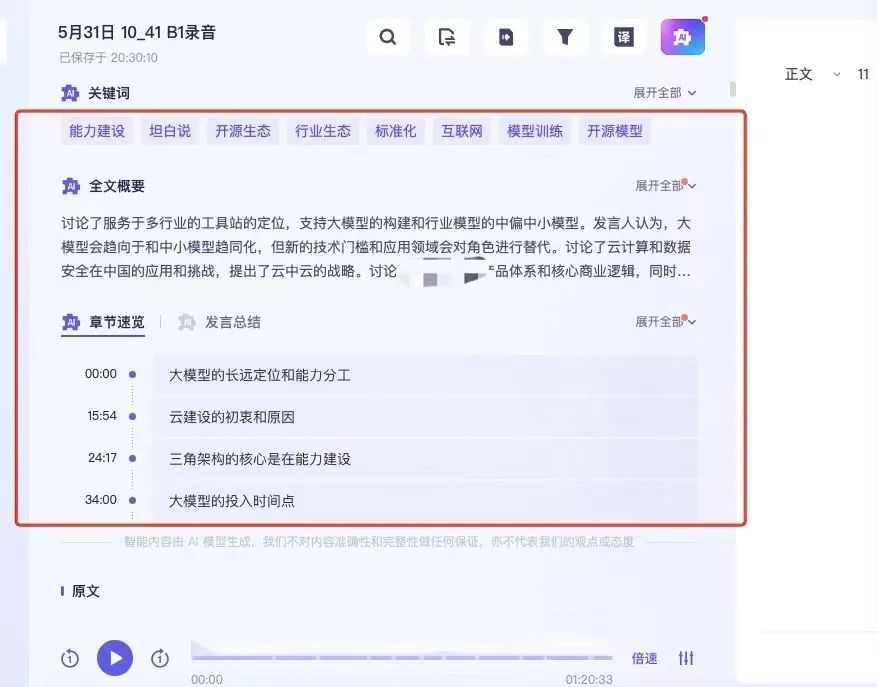有专注大模型研究的投资人表示,语音转文字能力各家其实差距不大,转写是一般能力,更重要的是能做到丢失重要内容的情况下去结构化改写总结才是突破。