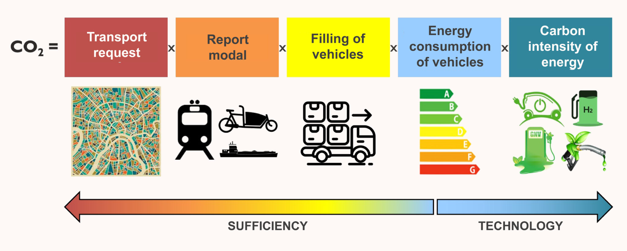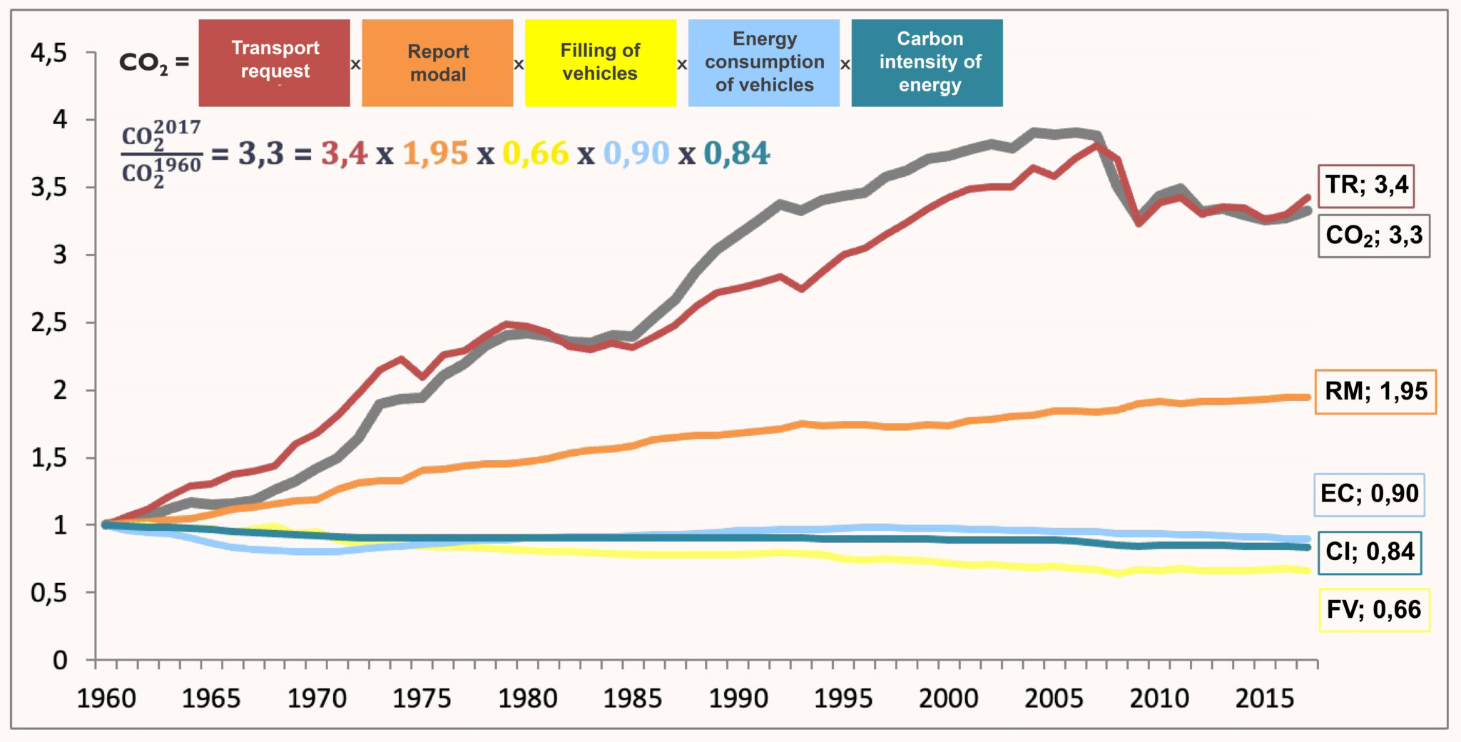 2017年法国货运产生的二氧化碳排放是1960年的3.3倍。排放量的变化有五个因素[5]。运输需求是最主要的因素,其计算单位为吨公里,增长源于货物量与运输距离的双重增长。1960-2017期间,尽管需求会在严重的经济危机(如石油危机、2008年经济危机)之后暂时下降,但总货运需求仍增长了3.4倍。