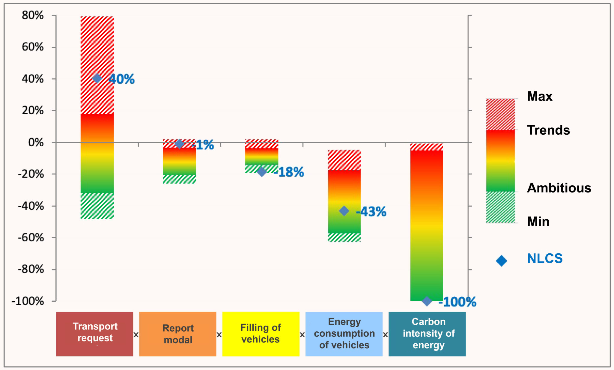 2020年发布的国家低碳战略预计2050年的法国运输需求会增长40%,超过了基于现趋势的预测值。四个基于最激进减排手段的情境的预测减排幅度平均值是30%。尽管需求变化对交通减碳十分重要,但国家低碳战略似乎不指望大幅减少需求。不过,总需求只要能减少,就能促使陆路运输的比重下降,铁路、水路比重上升,减排期望超过20%。