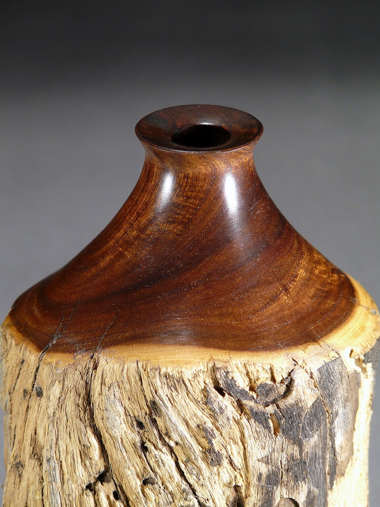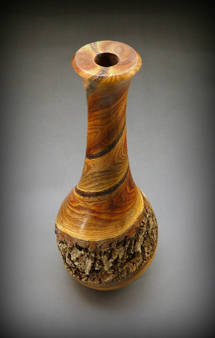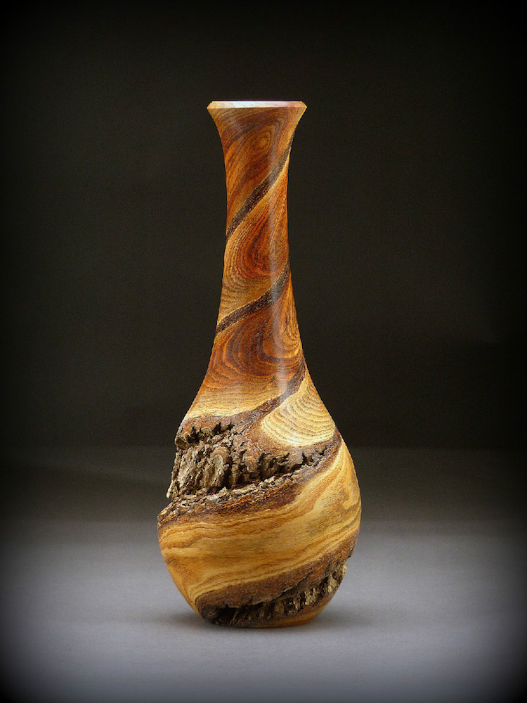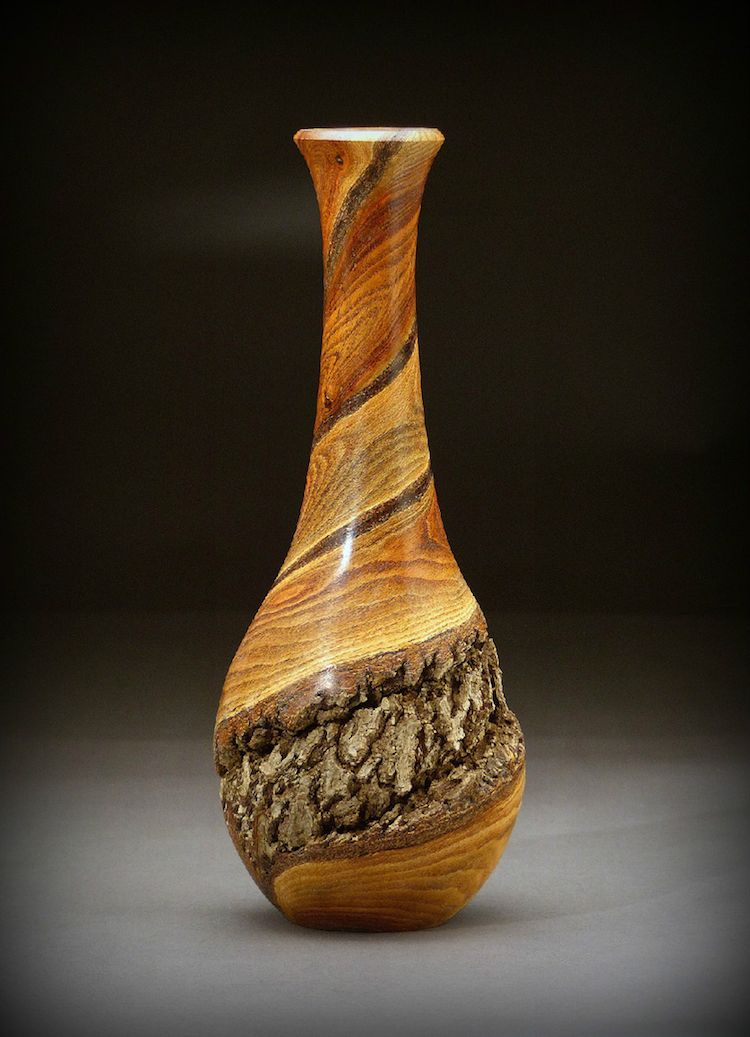 自从爱好了这项工艺,雷·艾斯林便开始将木旋工人作为自己的职业和谋生之道,持续地倾注着自己的热情于其中。“尽管我更多地将自己视为是一个工匠而非艺术家,但我确实在尝试将这些车削过后的木材打造出令人赏心悦目的光滑优美的曲线。”雷·艾斯林说道。这样的美学理念在他所打造的花瓶上尤为明显,这些花瓶的原材料往往都是雷·艾斯林从范围广泛的木材中精挑细选的,其中包括红枫(Red Maple)、美洲榆树( American Elm)、澳大利亚蛇纹树( Australian Snakewood)和南蛇藤葡萄树(Oriental Bittersweet Vine)等。通常情况下,雷·艾斯林所制成的花瓶都兼具两大创造性的特色,分别是光滑的表面和原始的木头纹理。二者的共存不仅给人视觉上的冲击,也带来不少令人入迷的想象。对木材自然美的利用,以及精巧的手艺,毫无疑问能让你看到一个两全其美的工艺品。