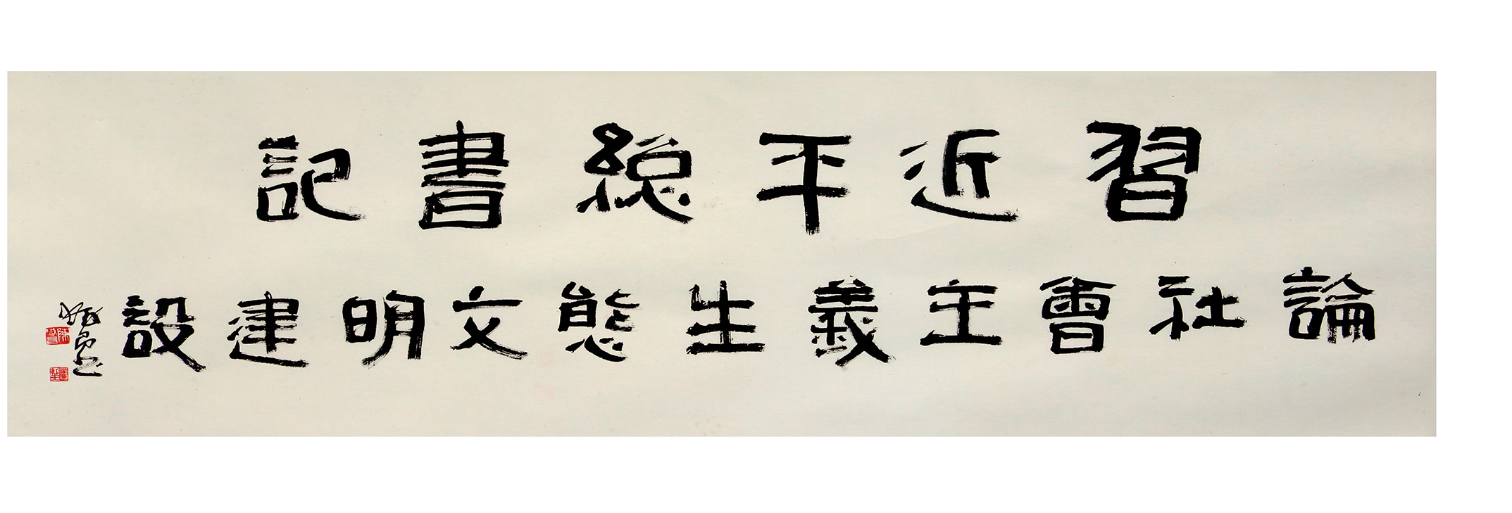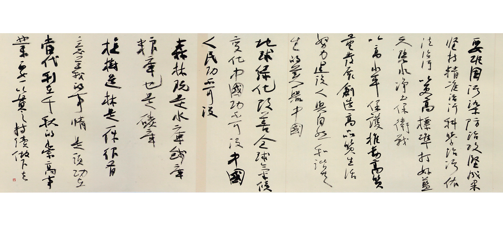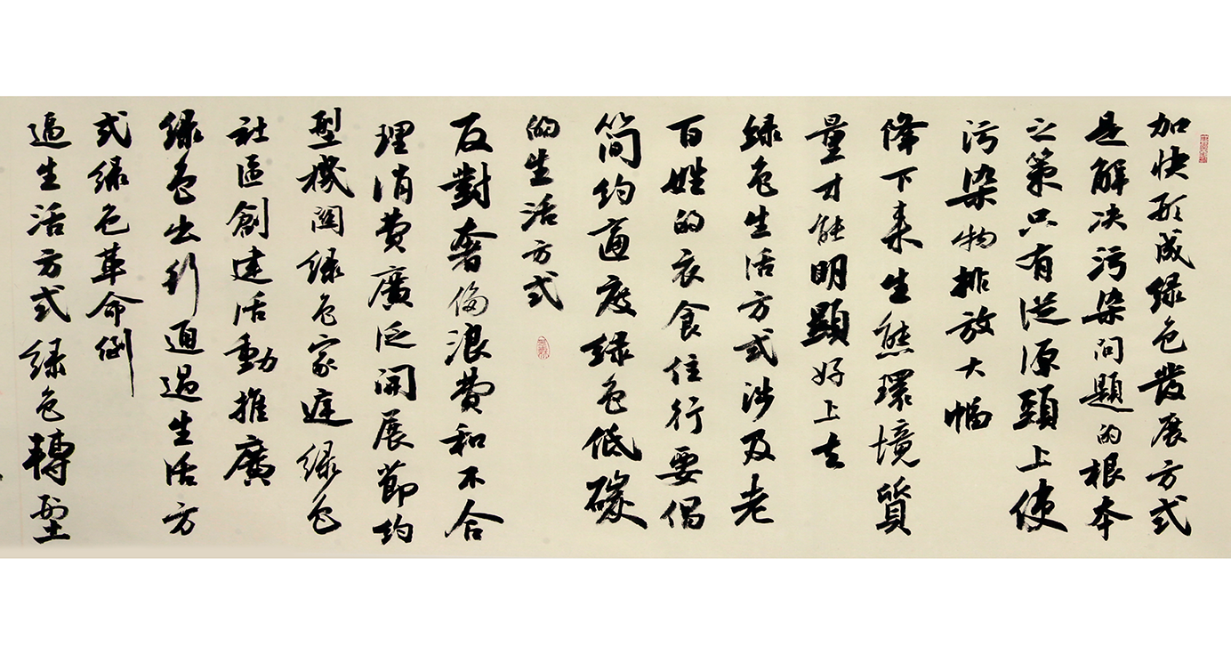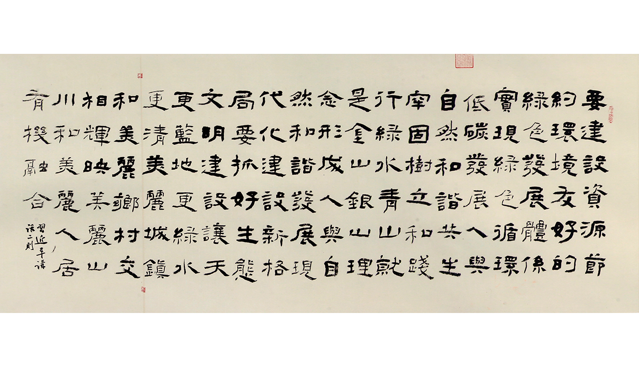 长卷的跋文由该市人大常委会原主任、邛崃市书法家协会名誉主席王一田题写,他表示,“绿水青山就是金山银山”,邛崃市望山亲水,古风今韵,生态本底良好。邛崃市书法家协会组织开展习近平生态文明思想主题书法长卷创作,具有丰富的思想内涵和深远的时代意义,体现了邛崃书法家强烈的家国情怀。