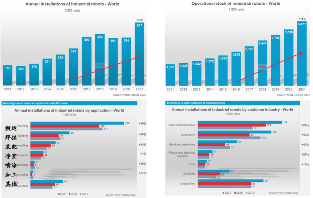 根据IFR(国际机器人联合会)在2022年世界机器人大会上公布的数据来看,2021年全球工业机器人新增安装量达到51.7万台,同比增长31%;累计工业机器人存量达到347万台。按照应用工艺分类,搬运机器人占比最高,占比达到44.5%;其次是焊接机器人,占比18.6%;按照行业领域分类,工业机器人在电子电气行业的应用占比最高,达到26.5%;其次是汽车行业,占比23.0%。