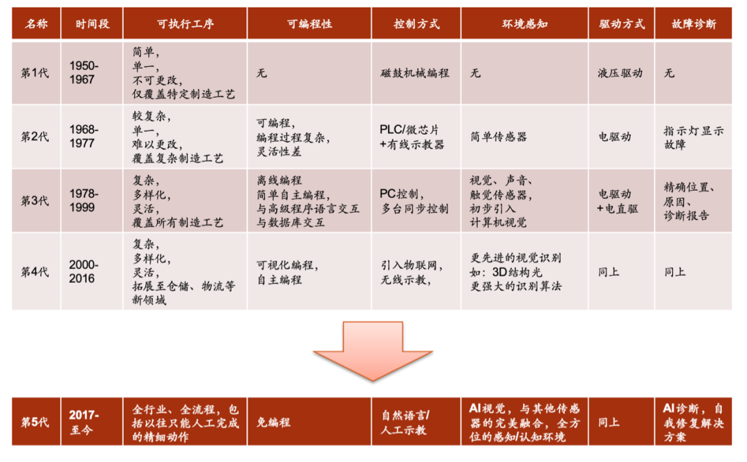 工业机器人本体历经70年发展已经进入技术成熟期,技术进化路线经历了从物理性能 → 软件控制 → AI辅助 → AI自主,目前已经发展到第5代,可进行全行业、全流程包括以往只能人工完成的精细动作,通过AI视觉与其他传感器的完美融合,可以全方位的感知和认知环境,实现AI诊断以及自我修复解决。同时,伴随机器视觉、MEMS传感器等领域的发展,其性能更强、效率更高、成本更低。工业机器人本体技术进化分析表