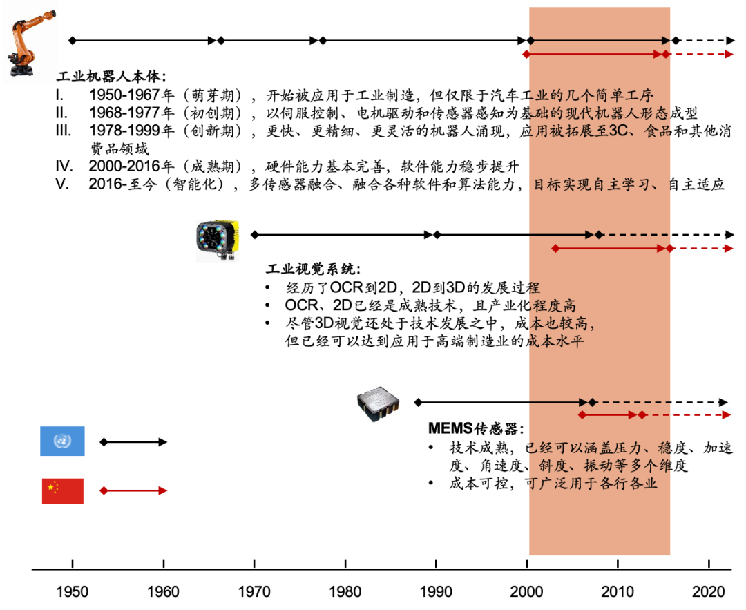 如下图所示,尽管我国在相关领域的起步发展是在2000年以后,相对较晚,但发展速度极为迅速。在机器人本体和工业相机市场,本土公司在中、低端领域已经占据相当的市场份额,高端技术研发也如火如荼。在MEMS传感器领域,由于起步较晚且国外公司在性能和成本方面的优势明显,国产替代发展潜力巨大。工业机器人发展历程