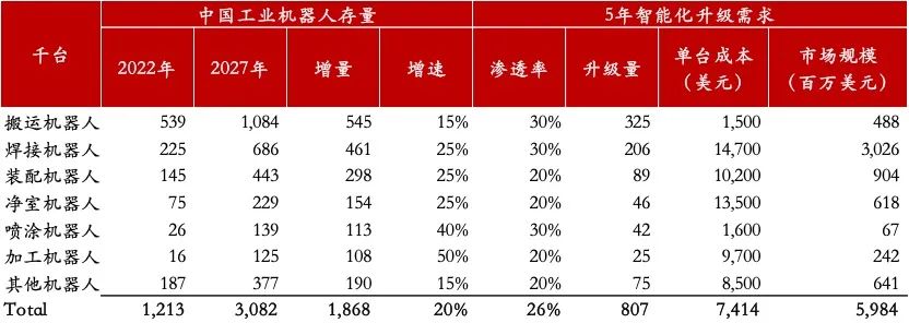 根据机器人数量和平均单价估算,当前全球工业机器人的规模约为198亿美元,中国工业机器人规模约为92亿美元。假设20%的单价进行智能化升级,在预测的行业增速和智能化渗透率下,未来5年国内工业机器人智能化升级需求累计总额约60亿美元。