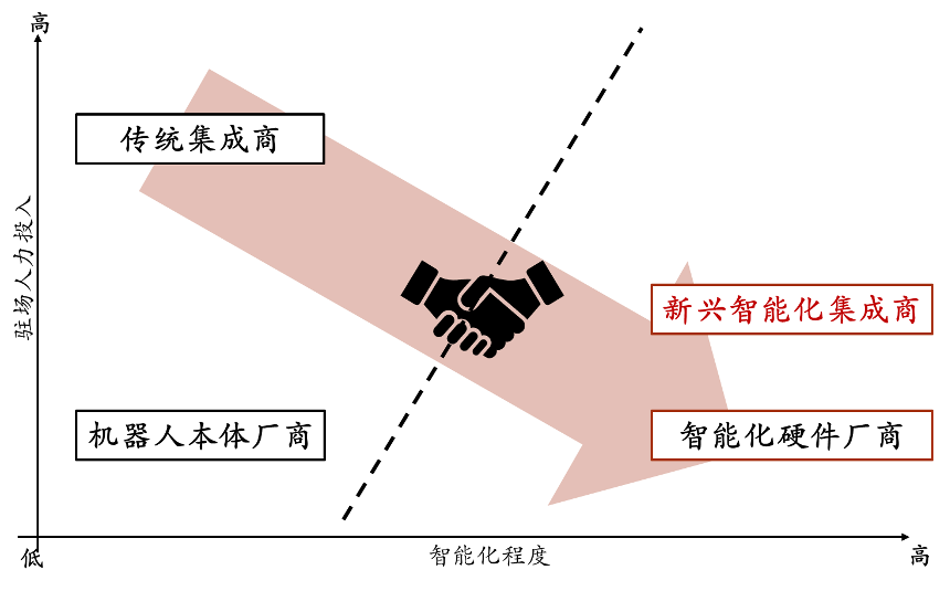 以集成和算法能力切入,近年来不断涌现出来一些具有较强的创新能力和灵活性的工业机器人智能化集成商。新兴集成商的规模小、渠道少,产品智能化不足,一般在以人力弥补的基础上会坚持完善产品,提高智能化水平,从而降低人力需求,与渠道资源丰富的传统集成商呈现互补状态。市场竞争格局分析图