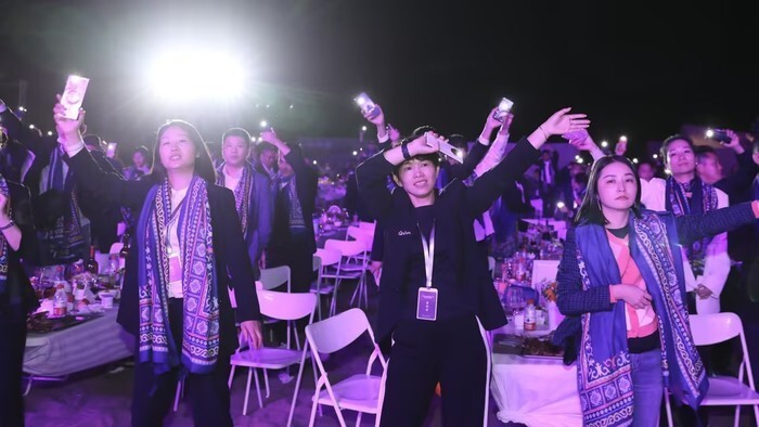 零点的钟声已经敲响,庆祝酒会进入尾声,董事长高丰携各位嘉宾领唱《明天会更好》,全场都跟着节奏高歌,歌声响彻大漠,灯光闪耀夜空,唱出对印象敦煌系列的期盼,唱出对全场来宾的祝福,将本次发布推向最高潮!