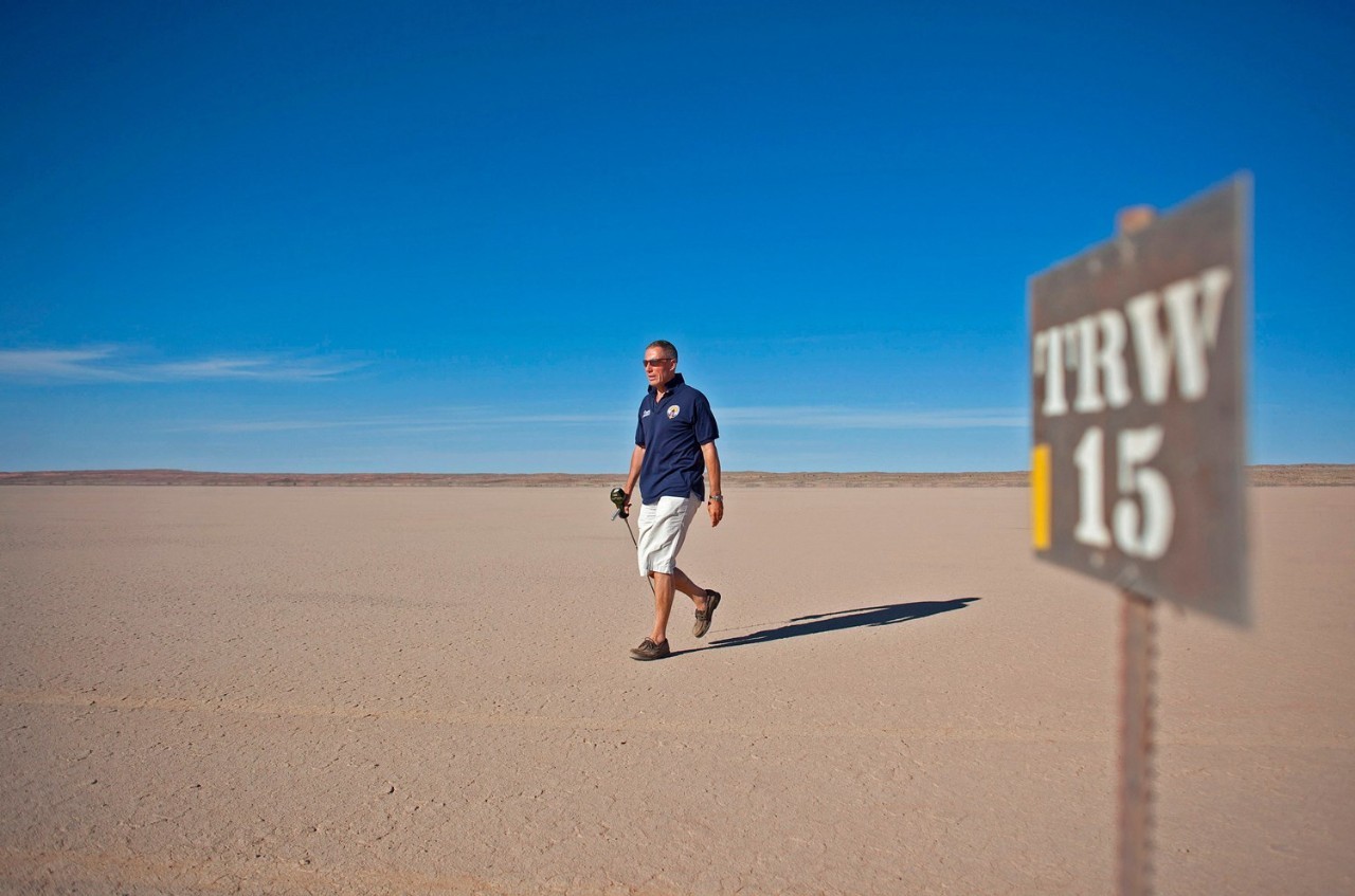 我和他很熟。五年前我们飞到南非的一个偏远地区,在那里他发现了一个干湖床,他认为这里足够坚硬,平坦也够大,可以用来测试每小时1609公里的车速。过去使用过的其他测试场地,例如美国的黑岩沙漠,面积太小不足以满足1609公里/小时的测试条件,或者表面破损程度太严重。