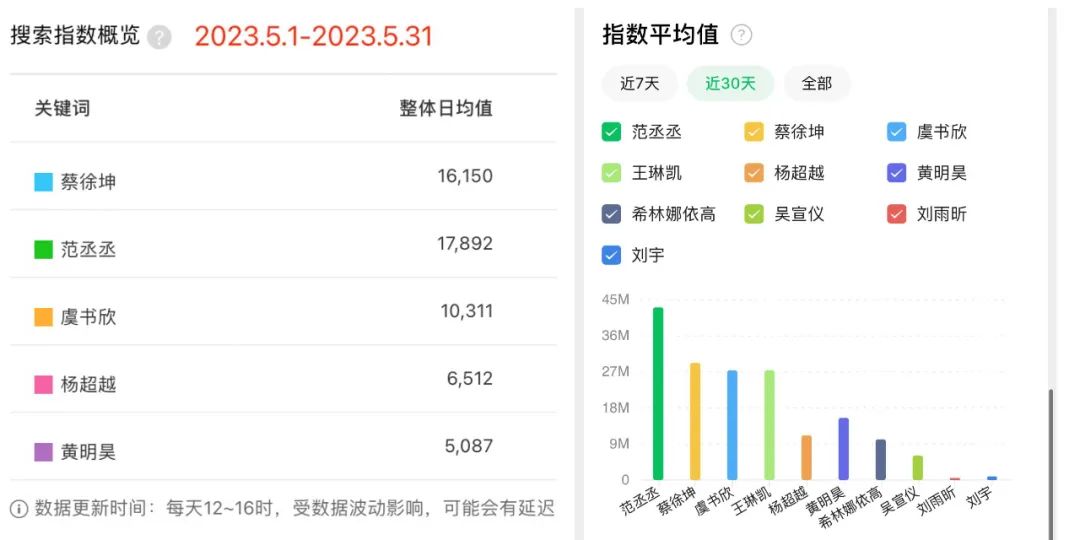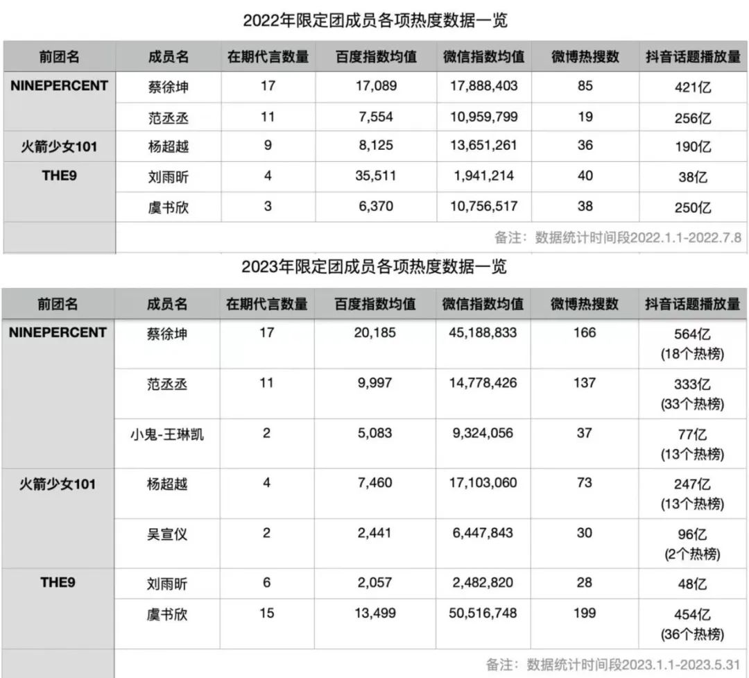 从百度指数、微信指数、微博热搜数、抖音话题播放量看,原本各项数据遥遥领先的“顶流”蔡徐坤,从去年下半年开始,逐渐被虞书欣弯道超车。