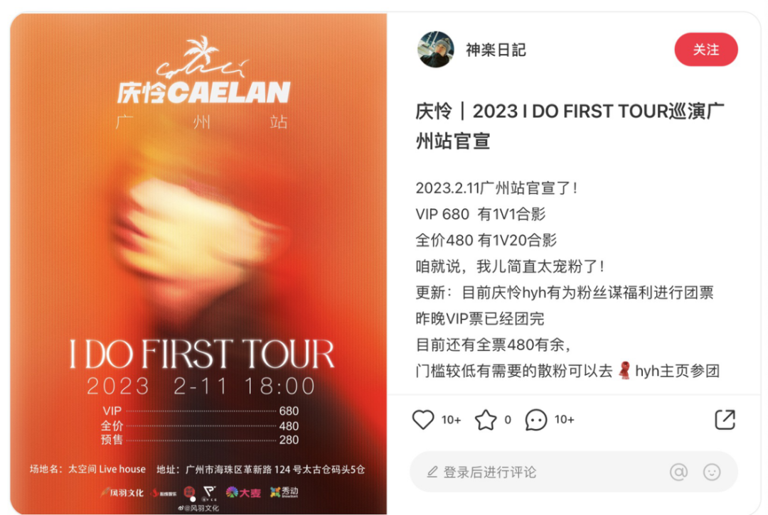 幸运的是,不论多糊的爱豆,都可以选择开巡演赚钱。今年演出市场放开,爱豆的巡演也遍地开花。票价300-1000元不等,有的VIP票还可以和爱豆合影、亲密接触,已经有丝芭模式“握手券”的神韵了。比如《创造营2021》卡位没出单的庆怜,巡演680元的VIP票,带有1v1合影与互动。大部分爱豆都会选择容纳千人的live house场地。一场演出下来,少说也能赚个十来万。