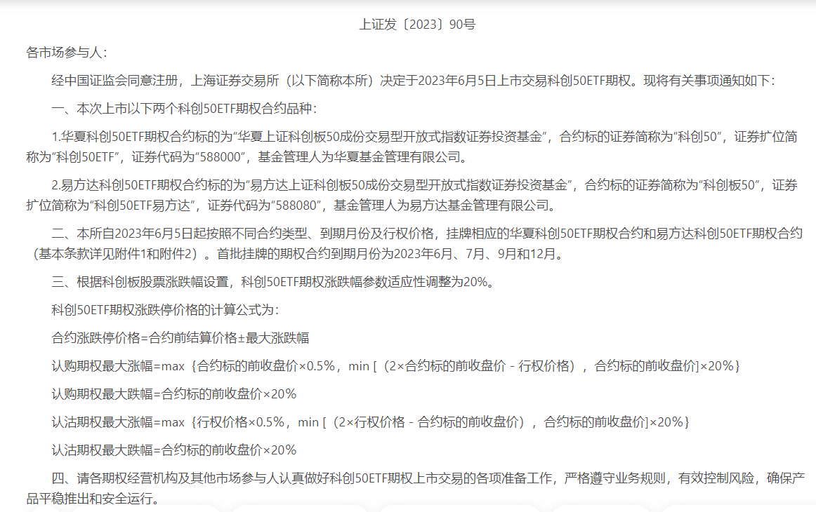 今日,上交所发布了关于上海证券交易所科创50ETF期权上市交易有关事项的通知,上交所决定于2023年6月5日上市交易科创50ETF期权。